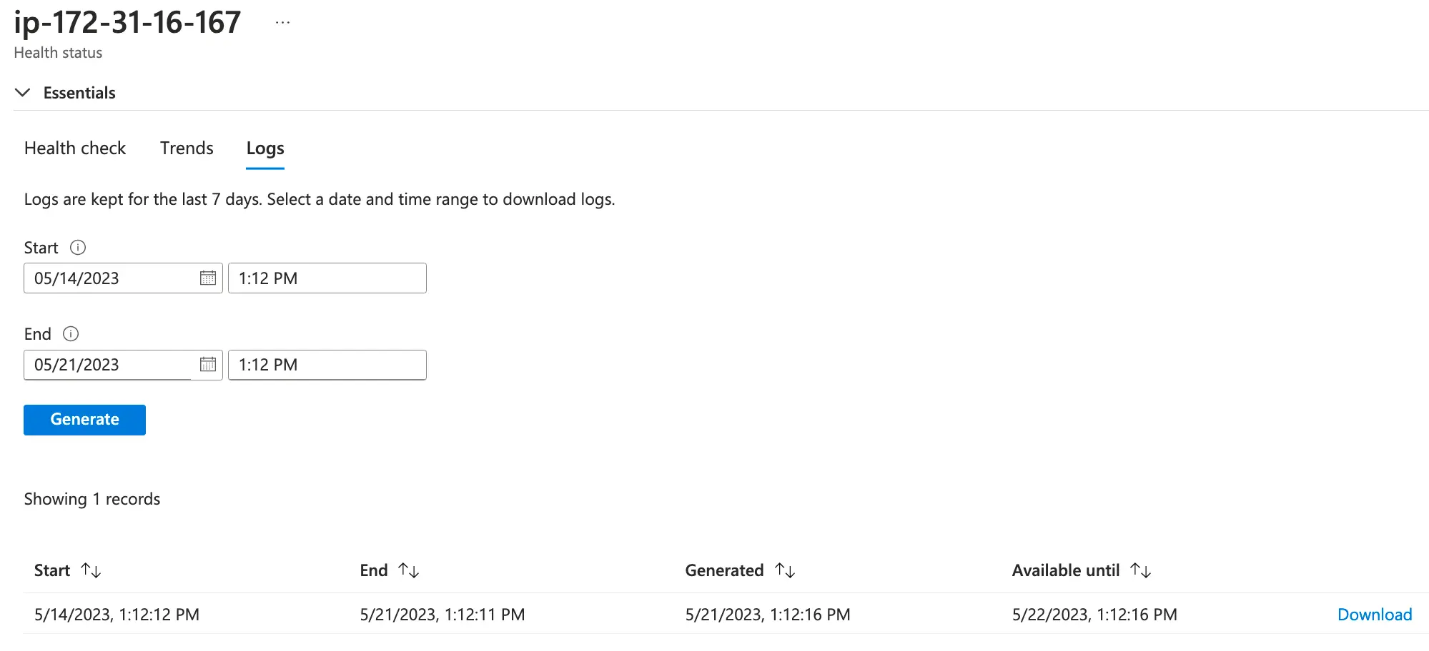 The Trends tab is pretty great for showing use and performance metrics, but we won’t have any of that data until clients start connecting. If we check out the logs tab, you’ll see we can choose a timeframe, then click the Generate button. This queries and pulls logs back from the containers for us - very cool!