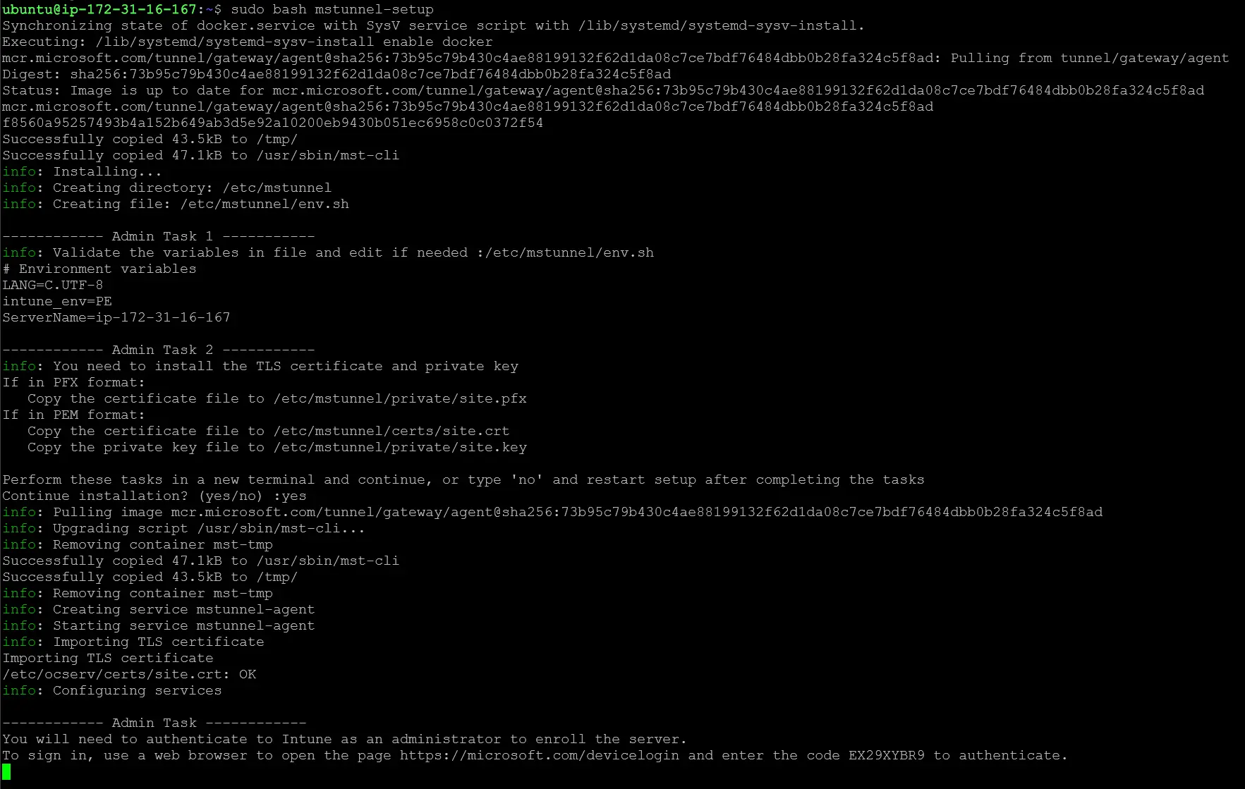 Now we can re-run mstunnel-setup, and we should finally have a successful install! Open your browser and complete authentication with Intune admin rights.