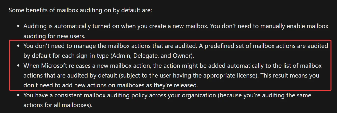Because mailbox auditing can generate a large volume of data, Microsoft provides the ability to bypass auditing for specific accounts (such as a service account, backup, etc.). It is important to verify accounts that can bypass auditing and also monitor for changes to this.