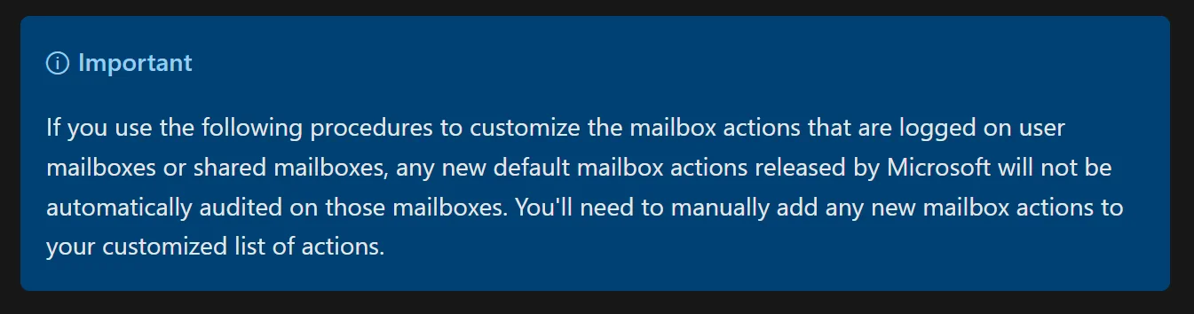 Final note: It is important to keep track of auditable events, and I will do my best to announce new ones when they are added (very rare). For a full list of auditable events, take a look at the docs: Manage mailbox auditing