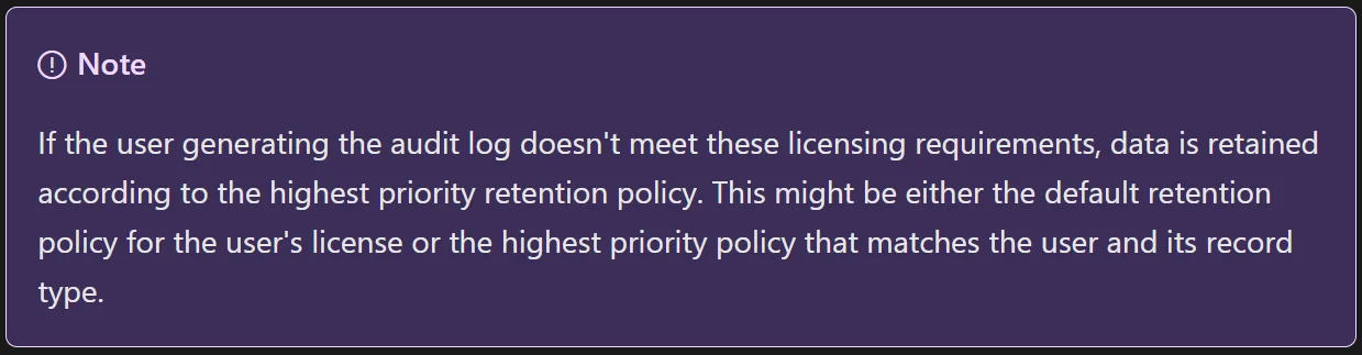 The first thing we want to do is ensure we are retaining audit records for as long as our license allows, and thankfully, this is one of the rare times Microsoft automatically handles license levels for us. As seen below, we can apply a retention policy to all users, and those without the license will simply retain for 180 days.